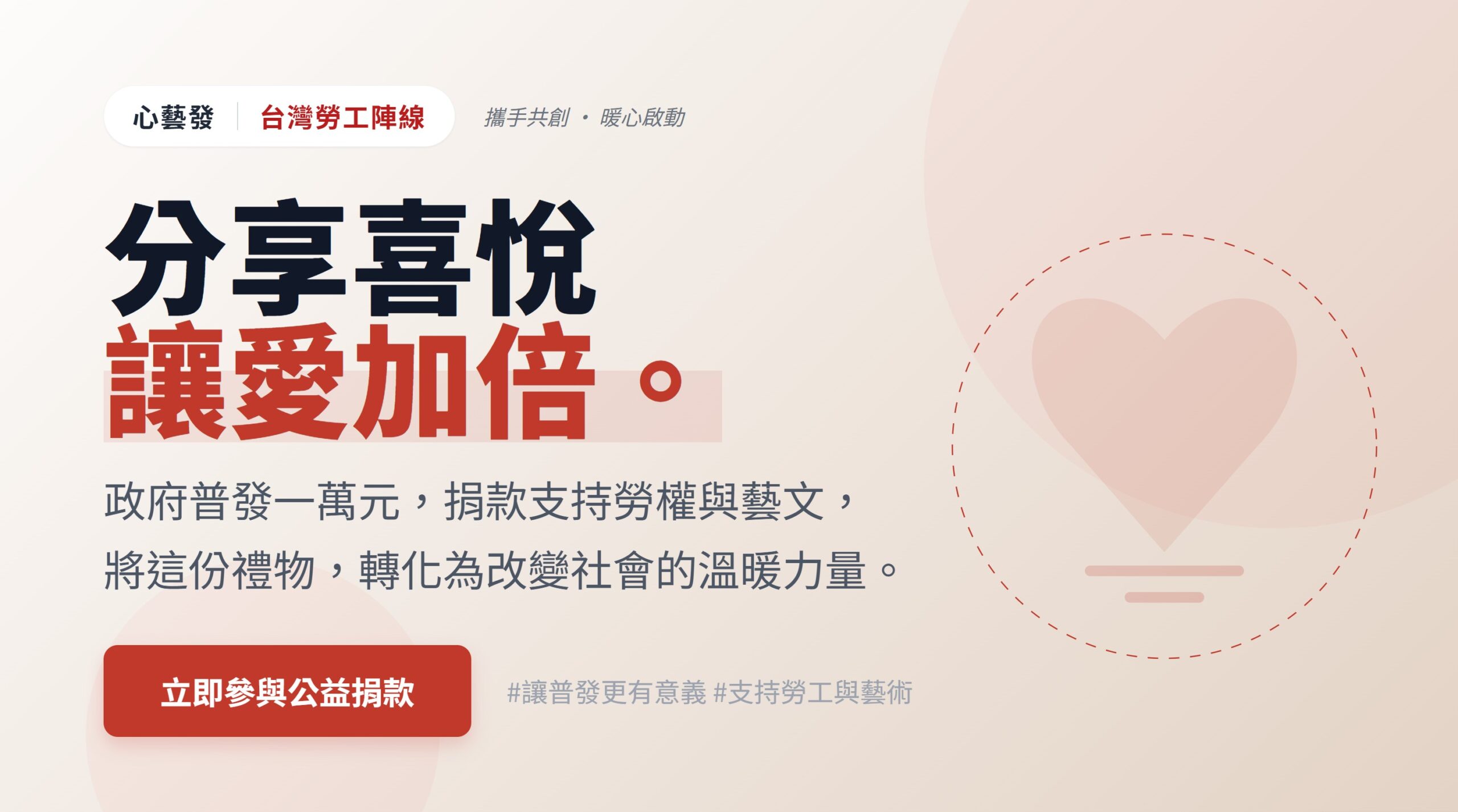 心藝發長期關注社會公益與藝術文化的結合,深知社會的進步不僅在於物質的豐饒,更在於人與人之間的互助與體制的完善。因此,我們與台灣勞工陣線(勞陣)攜手,發起「普發一萬,一人一半,感情較袂散」的公益捐款行動。